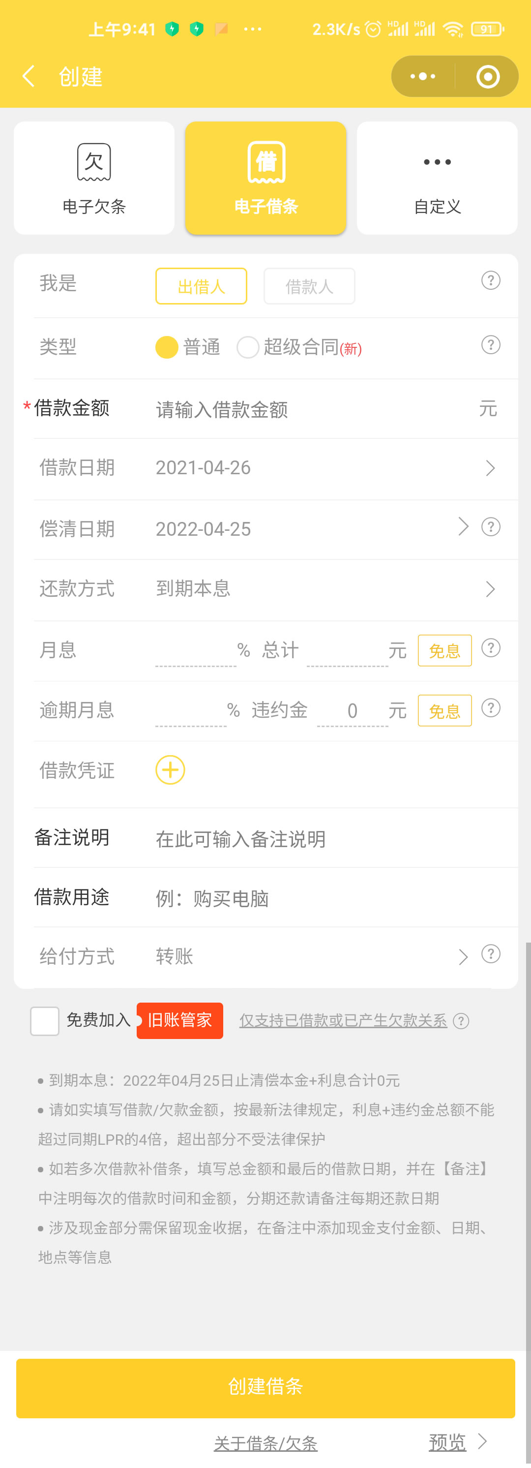 平台可以创建借条,欠条或者自定义合同,输入关键参数即可快速生成一份合法有效的借款/欠款合同,借款人或者出借人都可创建