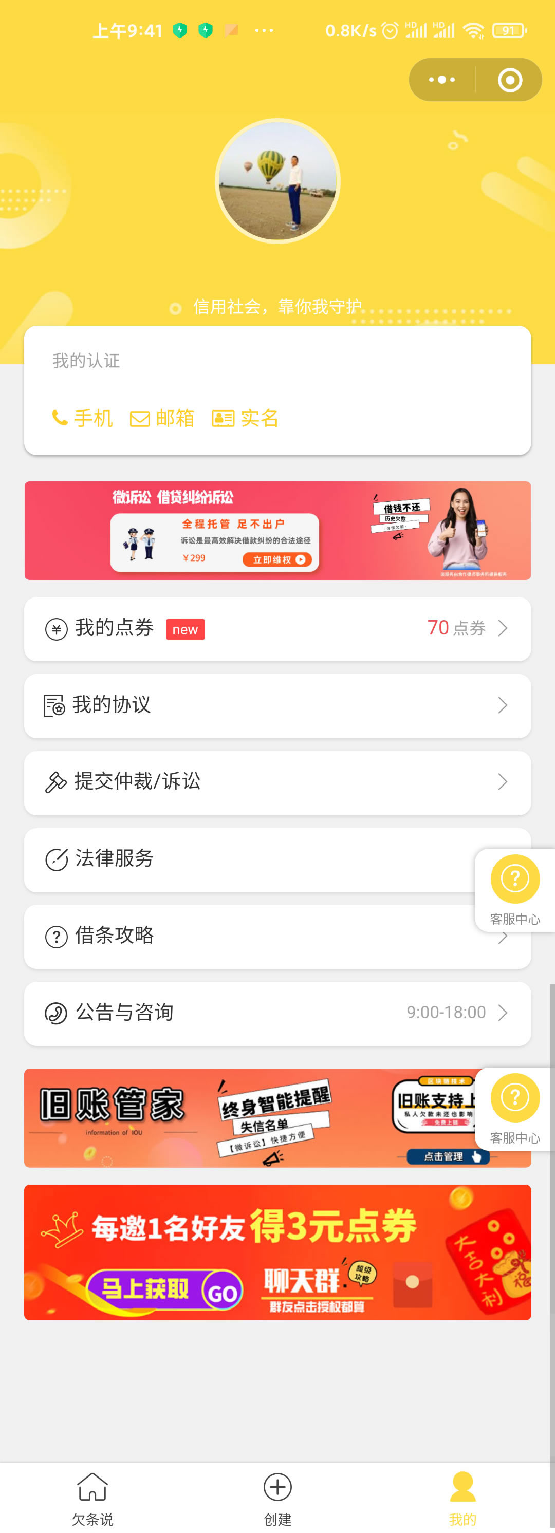 创建完成后可以通过微信直接发送给对方确认,对方也完成实名认证后可确认借款/欠款合同